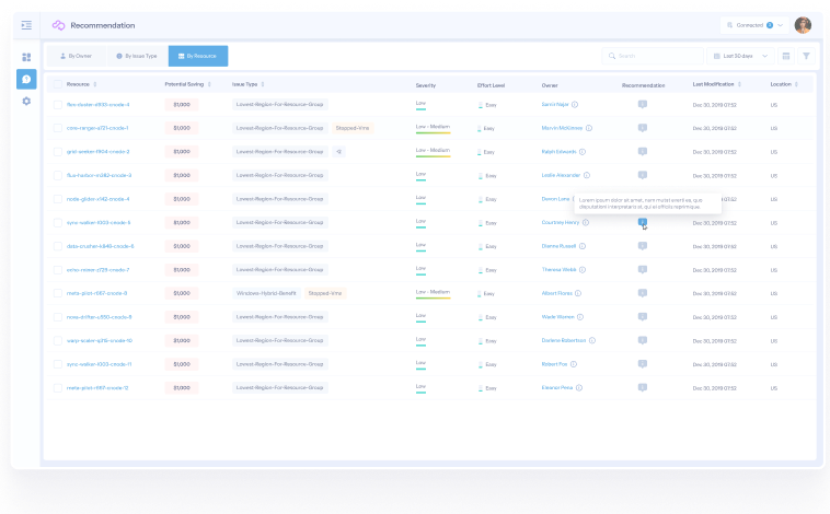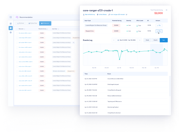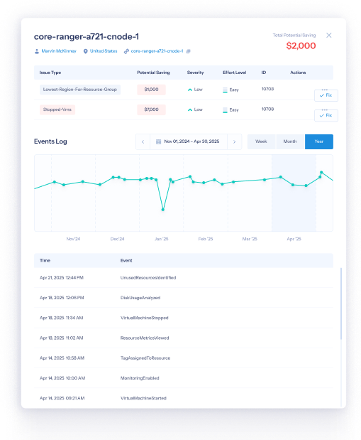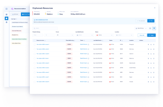 Atmoz scans continuously for unused assets, detached disks, idle IPs, storage, and initiates a process to safely retires or downgrades them