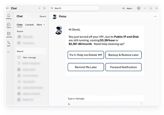 Recommendations with auto-generated commands, delivered in Teams, Slack, WhatsApp, or your console.